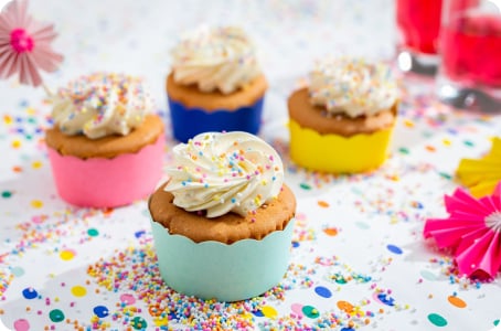 Maak er een feest van met onze Echte Boter muffins. Een heerlijk basisrecept met een topping van romige botercrème. Maak het helemaal af met vrolijk, gekleurde spikkels… gegarandeerd een succes bij kinderen!