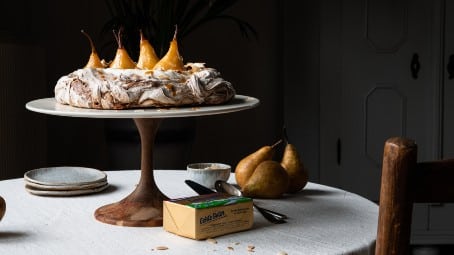 Chocolade pavlova met gestoofde peer in karamelsaus